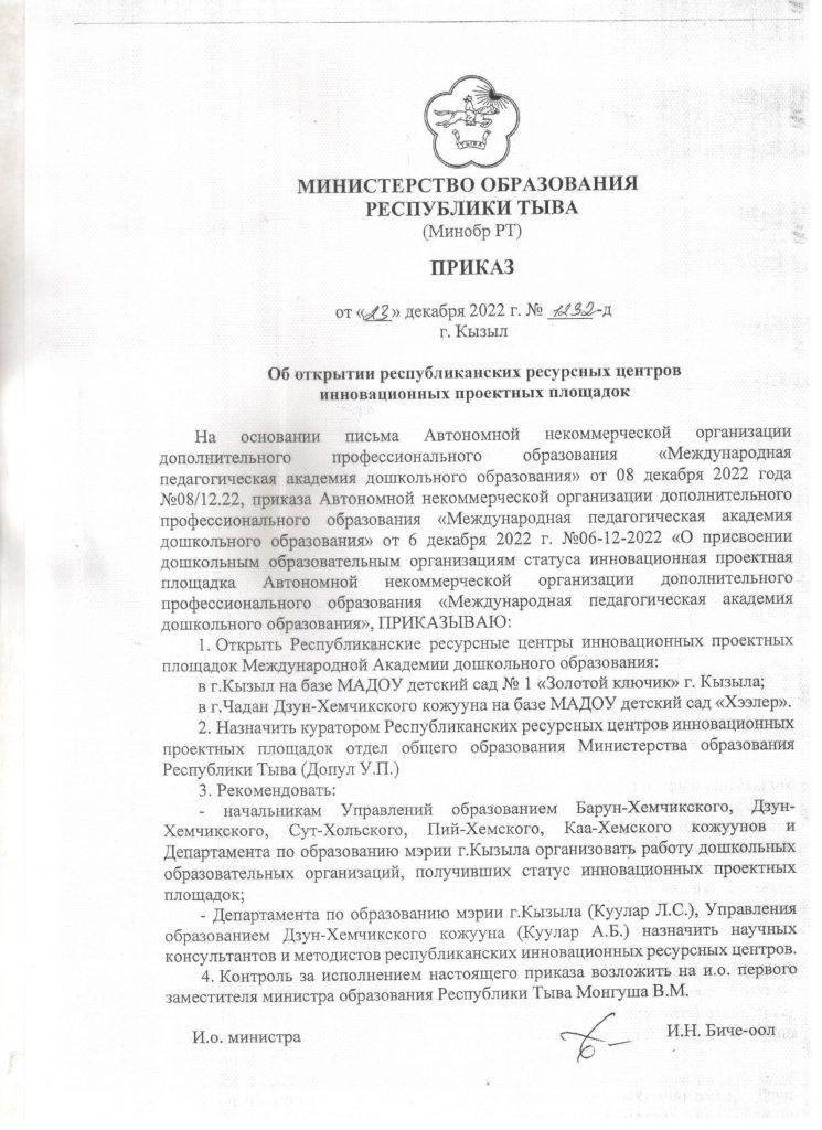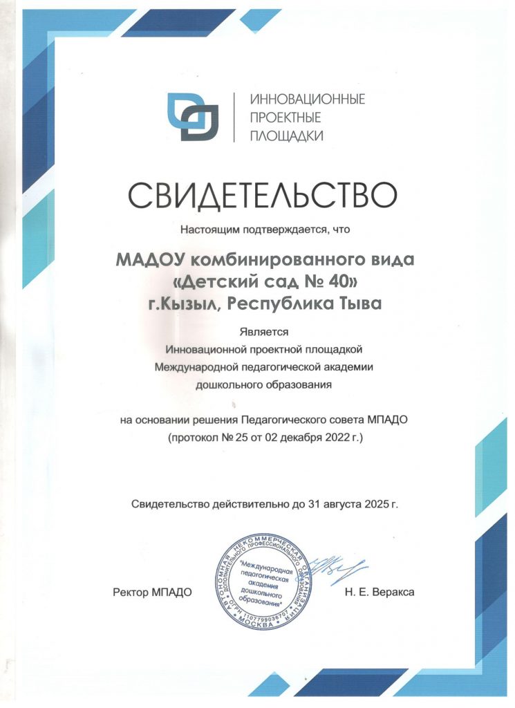Автономной некоммерческой организацией дополнительного профессионального образования «Международная педагогическая академия дошкольного образования» на основании Приказа № 06-12-2022 от 6 декабря 2022 года присваивается статус «Инновационная проектная площадка МПАДО» МАДОУ № 40 г. Кызыла РТ