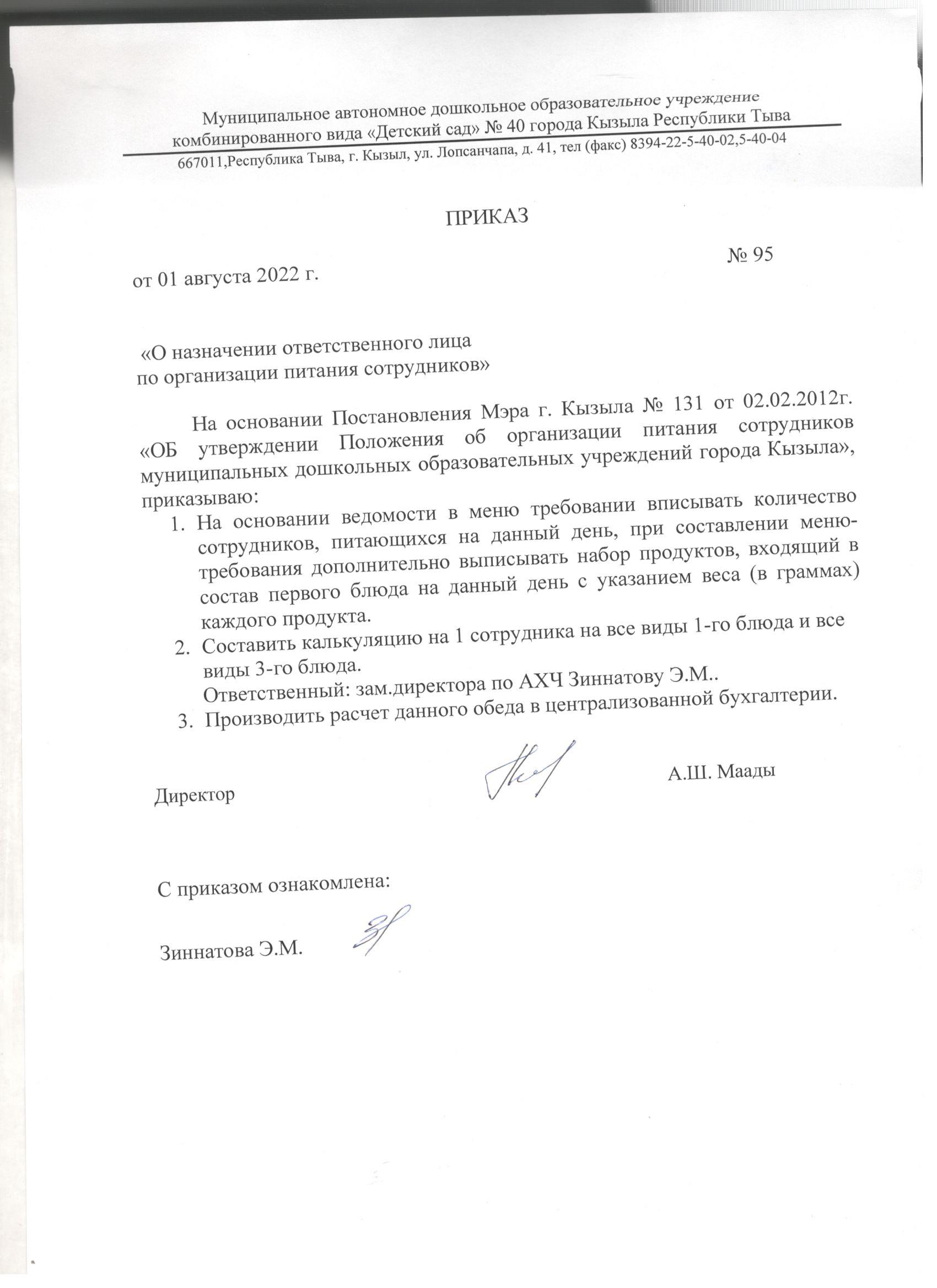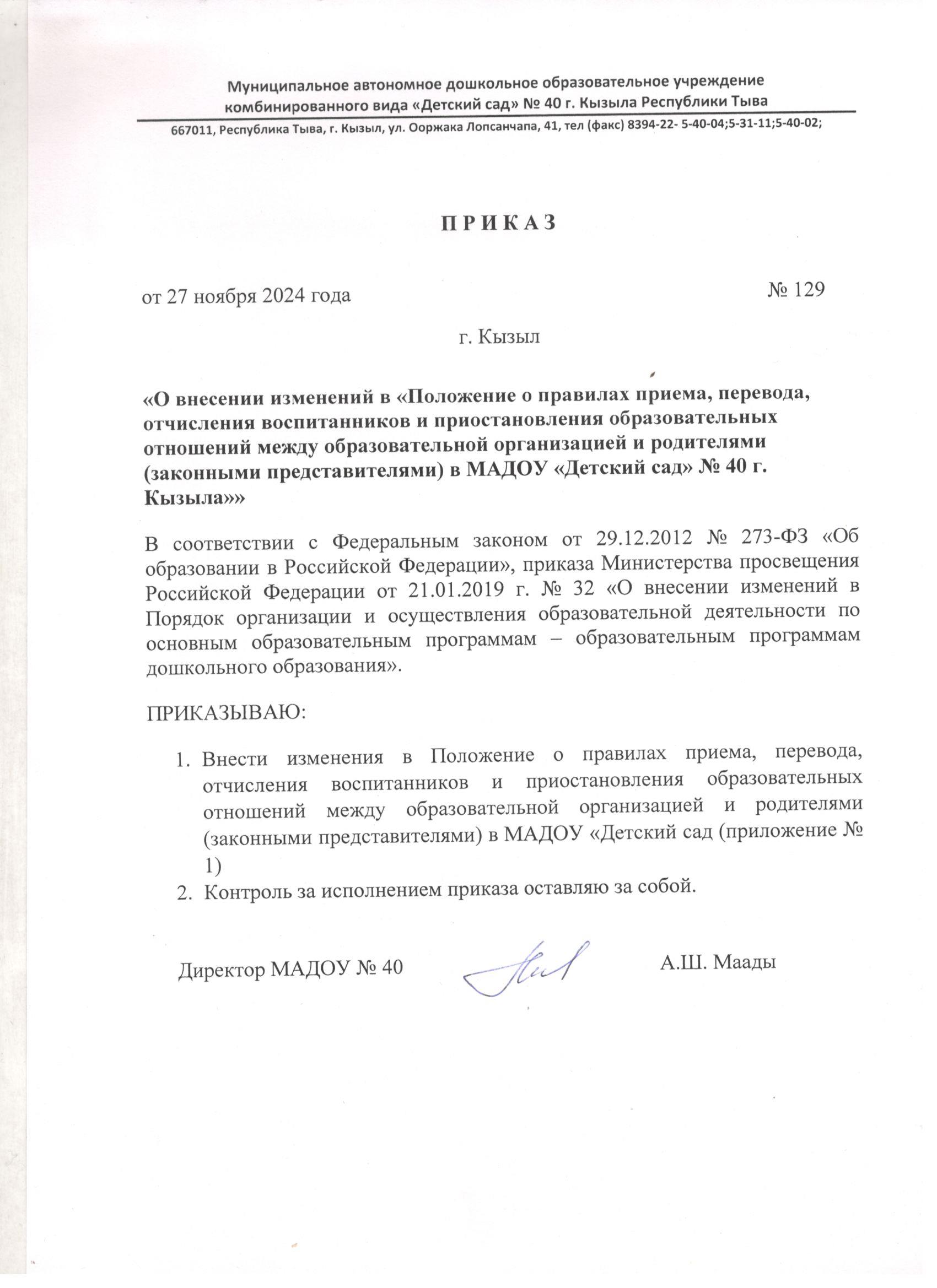 Приказ о внесении изменений в «Положение о правилах приема, перевода, отчисления воспитанников и приостановления образовательных отношений между образовательной организацией и родителями (законными представителями) в МАДОУ «Детский сад» № 40 г. Кызыла»»Скачать